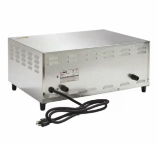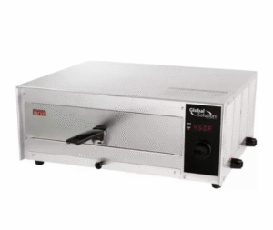 Countertop pizza oven with dual heating elements, 60-minute timer, stay-on feature, and removable crumb tray. Fits up to a 12” pizza.