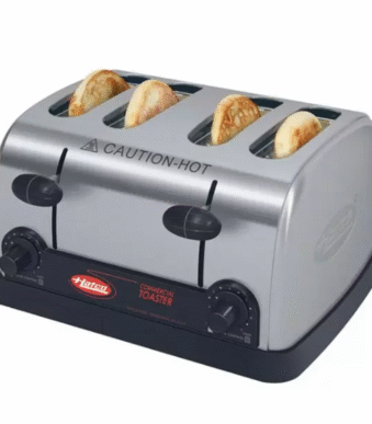 The Proctor Silex 24855 Extra-Wide 4 Slice Commercial Pop-Up Toaster features extra-wide 1.5" slots, durable stainless steel construction, and a manual Toast Boost for easy access, making it perfect for commercial kitchens.